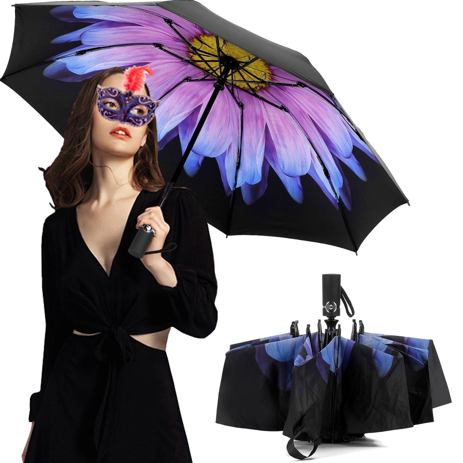 - UNIQUE INVERTED FOLDING DESIGH: This upside down umbrella takes a inside-out design. When close it, the wet part will be inside of the umbrella, preventing water from dripping,and it will not get yourself wet when getting in and out of the car. You don't even need to worry about this automatic travel umbrella will wet your floor and mat.