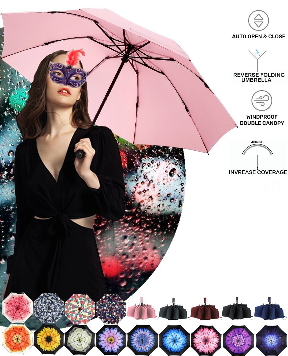 - UNIQUE INVERTED FOLDING DESIGH: This upside down umbrella takes a inside-out design. When close it, the wet part will be inside of the umbrella, preventing water from dripping,and it will not get yourself wet when getting in and out of the car. You don't even need to worry about this automatic travel umbrella will wet your floor and mat.