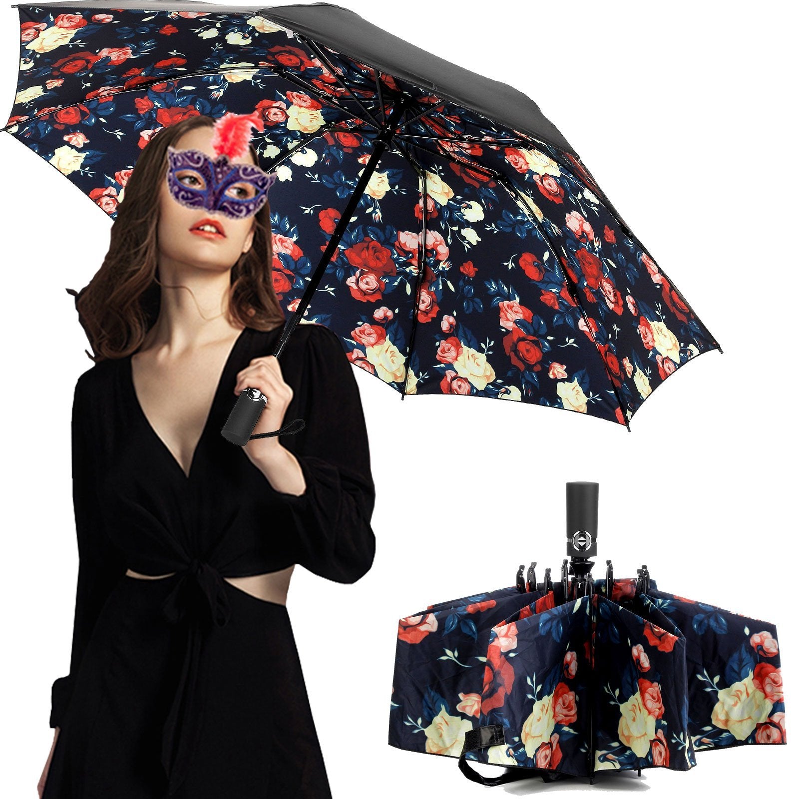 - UNIQUE INVERTED FOLDING DESIGH: This upside down umbrella takes a inside-out design. When close it, the wet part will be inside of the umbrella, preventing water from dripping,and it will not get yourself wet when getting in and out of the car. You don't even need to worry about this automatic travel umbrella will wet your floor and mat.